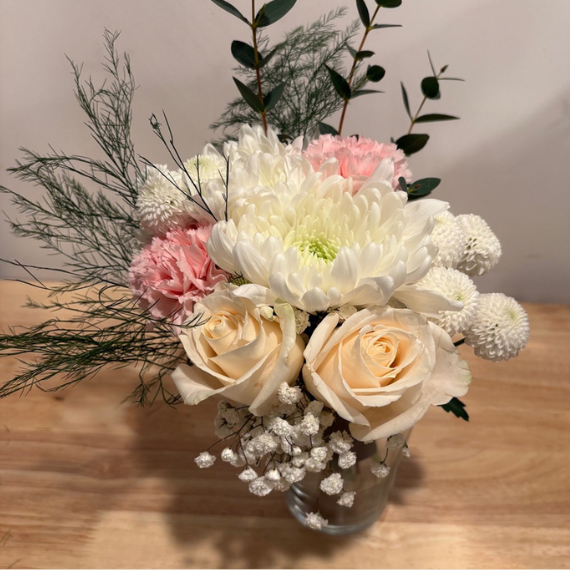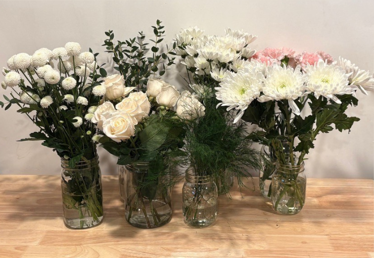 Assorted flowers, ribbons, and floral tape (enough to make at least 5 bouquets) ~$115